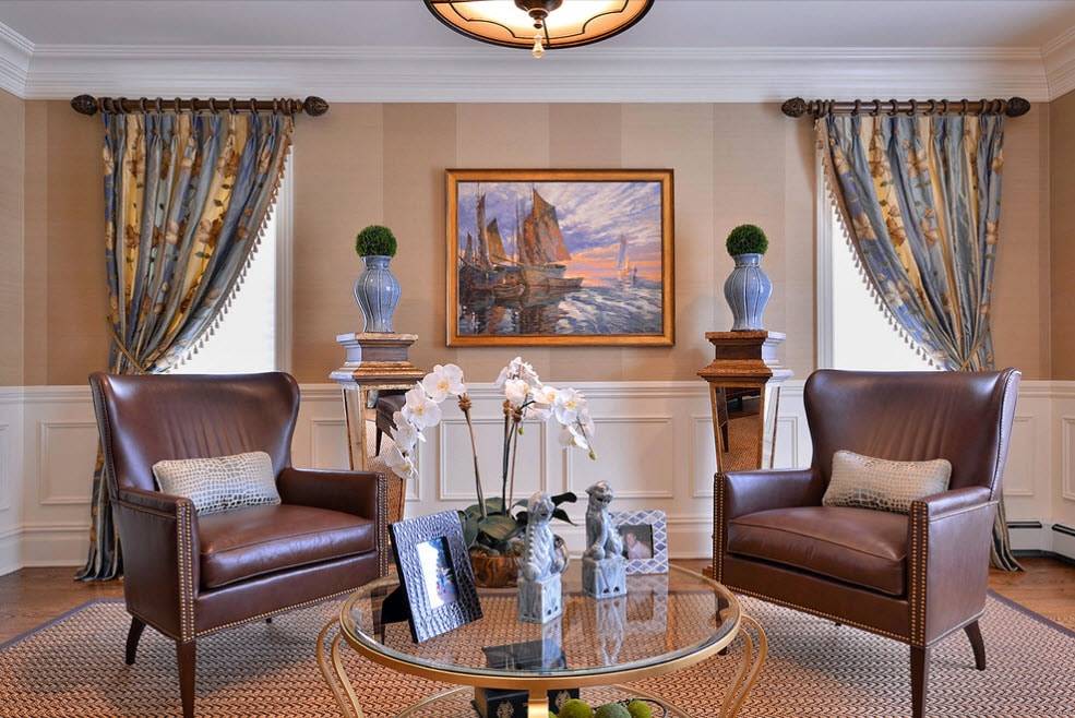 Для таких помещений лучше всего использовать отделку приглушенных, природных оттенков, украшенных природными орнаментами. Поэтому оптимальными для такой гостиной будут комбинированные обои желтого, зеленого, фиолетового оттенков, дополненных цветочными и растительными мотивами. Основной акцент делается на натуральности во всем интерьере: включая шторы, аксессуары, мебель. Рекомендуется делать уклон в сторону плавных линий и округлых форм.
