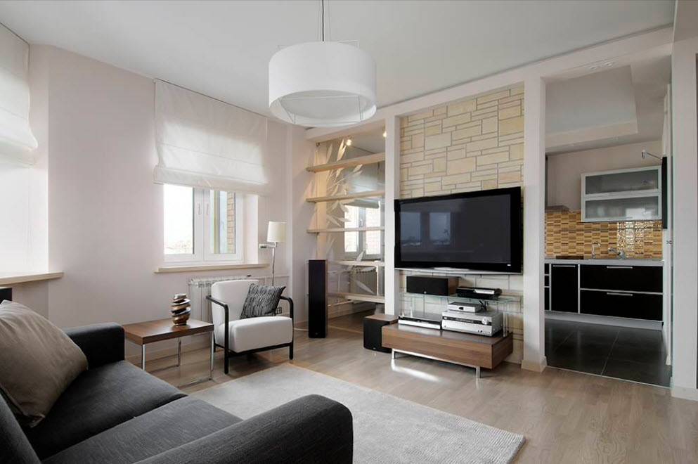 Гладкие однородные полотна – не лучшее решение для маленькой гостиной. В таком случае стены выглядят уныло, поэтому кажется, что здесь явно не хватает активного вмешательства декоративных элементов – картин, фотографий, плакатов и пр. Но изобилие подобных вещей – проигрышный вариант для компактного помещения. Поэтому советуем отказаться от такого рода дизайна.