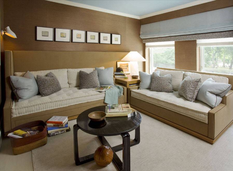 Если низкий потолок – основная проблема гостиной, разделите пространство по высоте. Подберите два вида обоев, гармонирующих по цвету или сюжету рисунка. Можно оклеить треть стены внизу обоями с темным оттенком, остальные поверхности – светлыми. Или наоборот, низ пусть будет светлым, а верх – с глубоким насыщенным цветом.