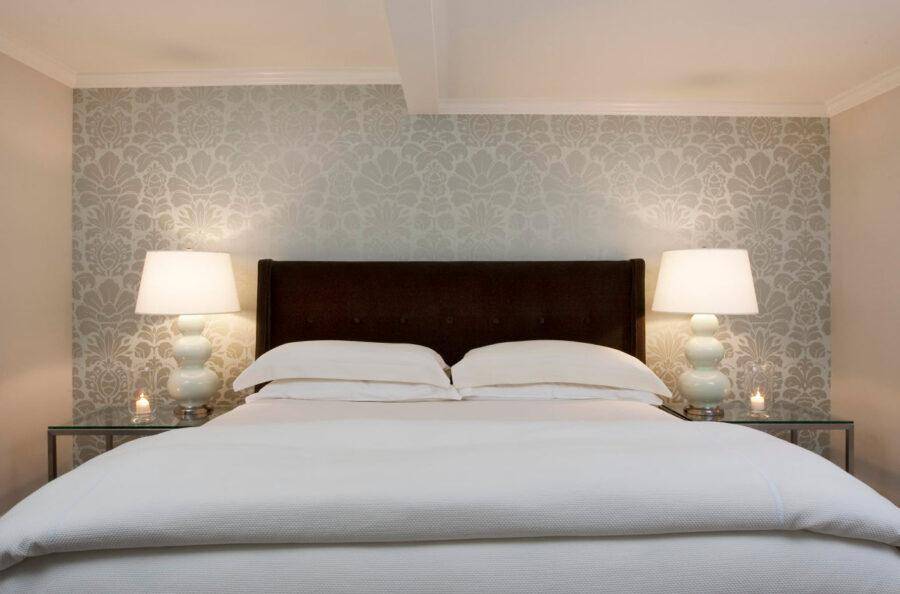 Светлые обои отлично подчеркивают простоту и элегантность данного направления. Белоснежные стены, текстиль и мебель такого же цвета создают особый роскошный интерьер. Для контраста допустимо применение мебели и аксессуаров, окрашенных в насыщенные яркие тона.