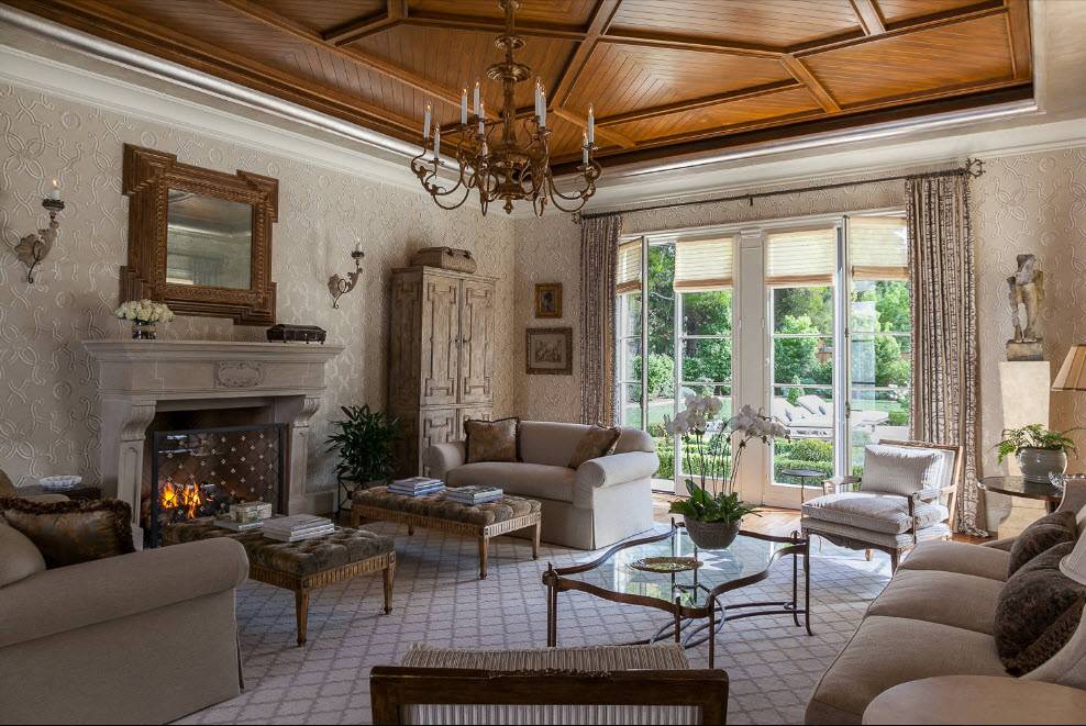 Оптимальным выбором будут фактурные стильные фотообои, украшенные геральдическими рисунками, вензелями, цветами. В качестве альтернативы можно использовать однотонную отделку. При выборе мебели следует отдавать предпочтение предметам с эффектом старины. Мебель должна иметь округлую форму, отлично смотрится в гостиной этого стиля комод со стеклянными дверцами и камин.