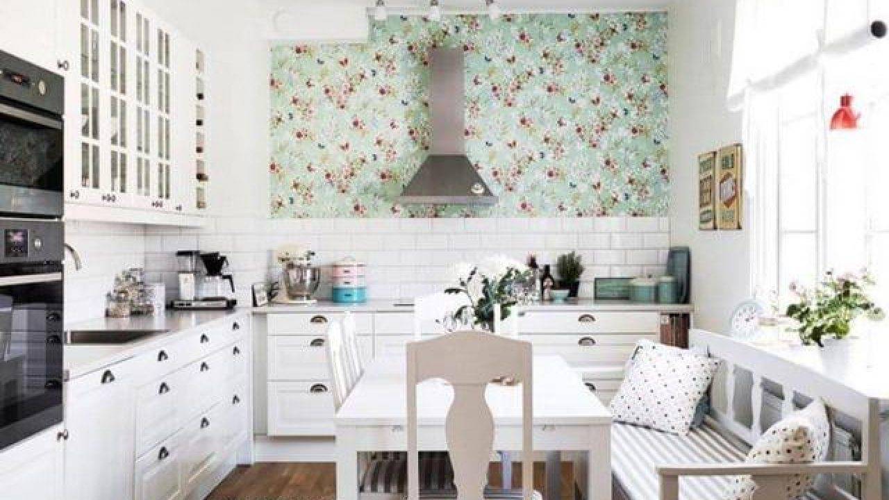 Романтичный дизайн позволяет декорирование интерьера яркими и светлыми оттенками. Дизайн в 2022 году позволяет выбирать обои на кухню с природными узорами. Лучшим вариантом станет имитация листьев деревьев, насекомых, цветов или веток.
