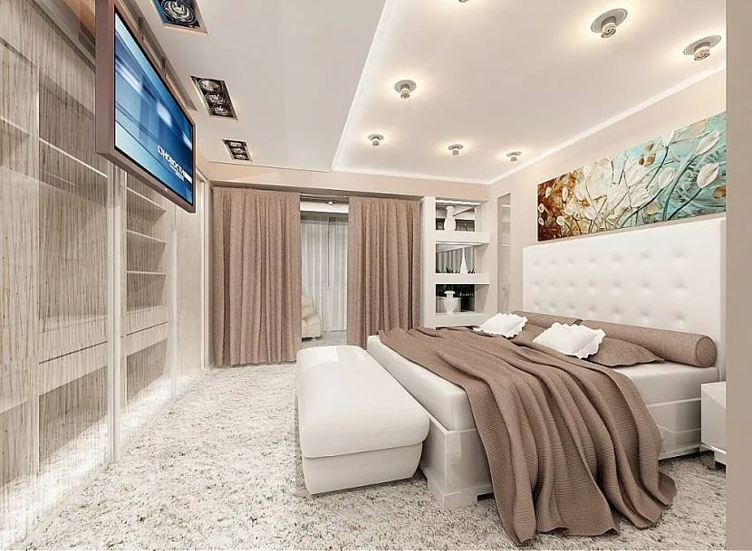 интерьер спальни в светлых тонах будет строиться на контрасте белого и