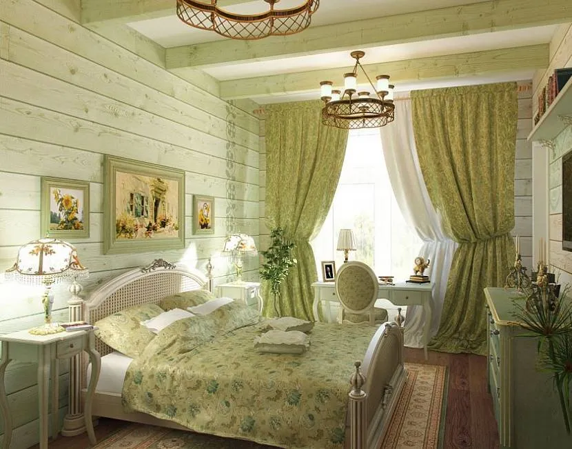 Оформить в стиле прованс спальню в брусовом доме довольно легко. Нужно просто оставить стены и потолок без современной отделки, повесить на них люстру и светильники со стеклянными плафонами и картины, изображающие природные пейзажи. Такая комната будет выглядеть одновременно аутентично и эстетично.