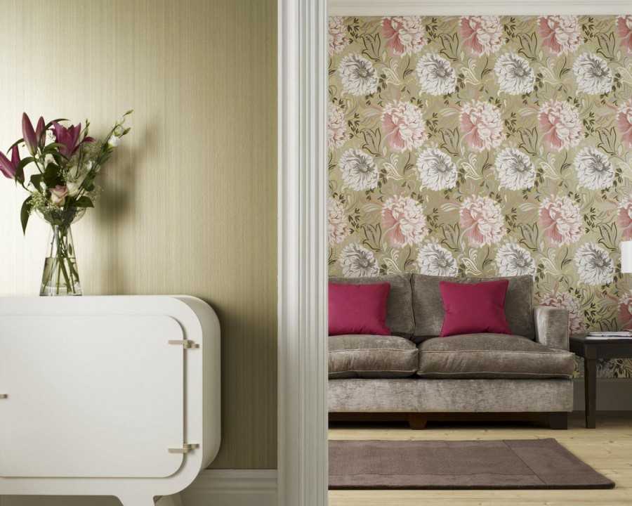 Стиль другой, принцип подбора обоев тот же: цвета должны повторятся в обивке мебели, аксессуарах или в текстилеБледно-желтые цветы в гостиной стиля модерн