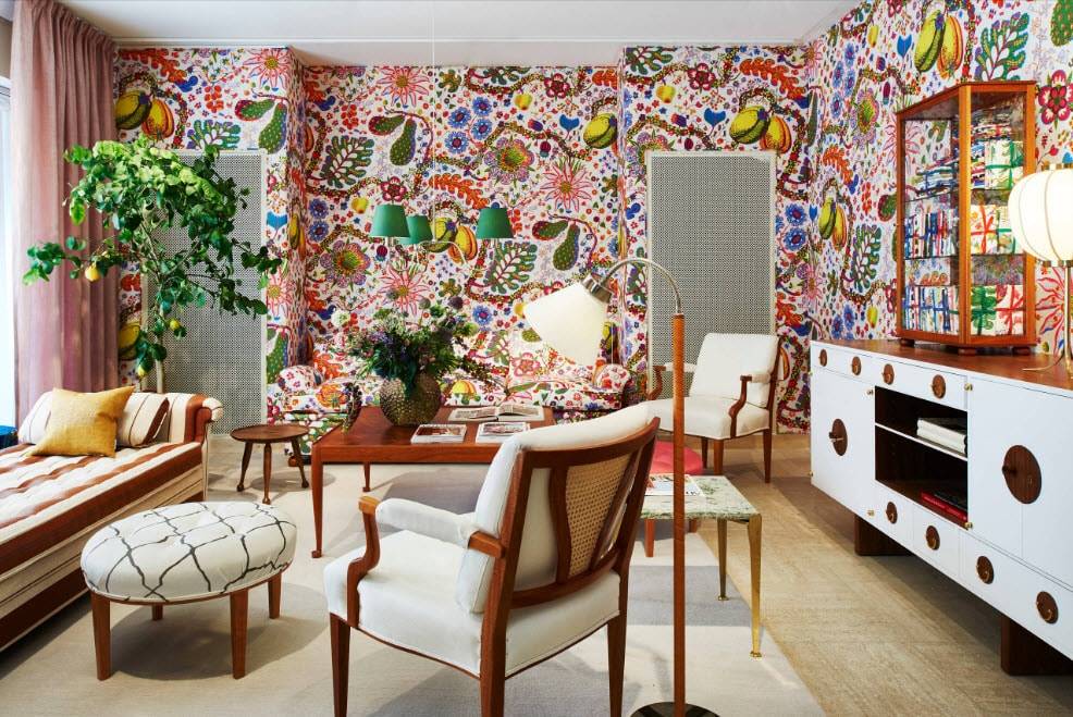 Флористические орнаменты выглядят более нежно, если однотонные цветки располагаются на светлом фоне. Яркие букеты придают гостиной жизнерадостность и игривость. При комбинировании полотен с крупными и маленькими цветами получается пышный нарядный интерьер. Обычно подобные рисунки создаются при помощи розовых, бордовых, красных тонов, но нередко используются оригинальные синие, золотистые или черные оттенки.