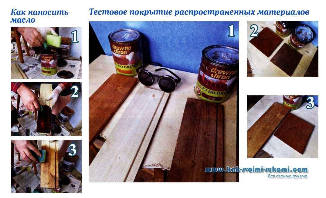 - Проверить оттенок масла на малом, незаметном участке древесины (при необходимости, можно добавить к средству тонировку).