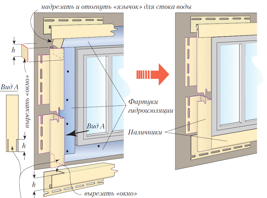 Закрепляя сайдинг своими руками с утеплением, можно столкнуться с трудностями именно на этом этапе работ. Крепление в этом случае зависит от того, как проем расположен относительно плоскости наружной стены: заподлицо или утоплено.