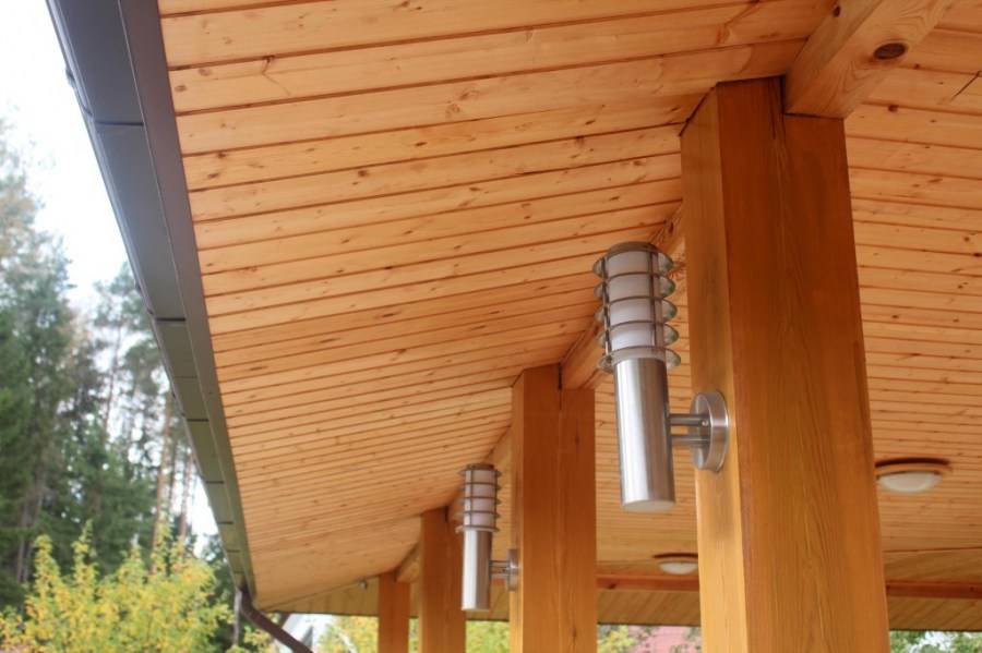 Если угол наклона кровли небольшой, софиты могут быть установлены параллельно стенам, прямо на стропила. В таком случае угол подшивки будет совпадать с углом ската