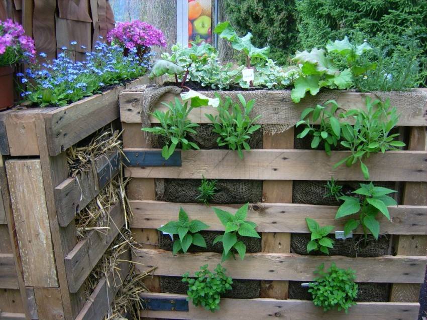 Используют для вертикальных грядок и подручные составные детали: контейнеры, ящики, стеллажи, этажерки, устанавливаемые в различные композиции. Можно приспособить даже комод, горшки различной конфигурации и габаритов, обрезки труб, покрышки.
