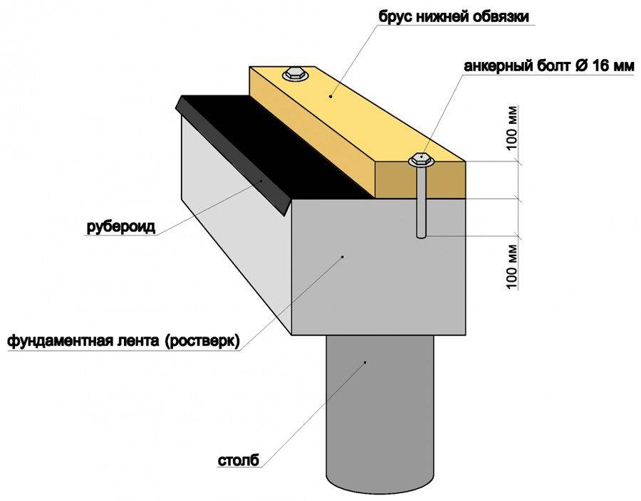 Слой обвязки обязательно должен повторять контуры фундамента. Если будут несовпадения по ширине, то станет скапливаться влага, что приведет к разрушению древесины.