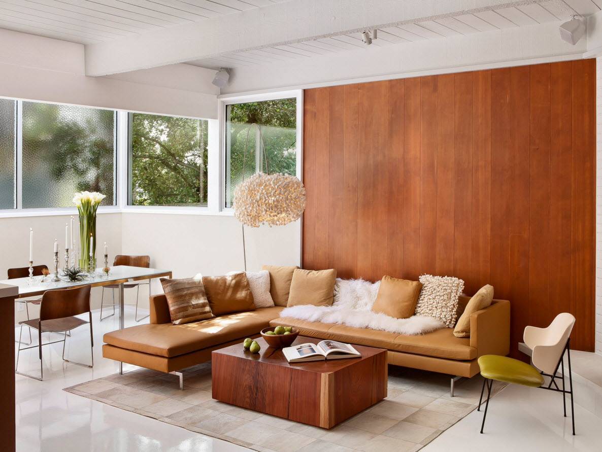 Уютная гостиная с яркими элементами декора и с мебелью цвета орех