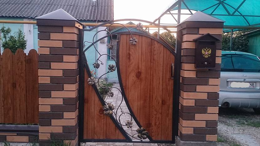 Иногда столбы дополняют уличными фонарями, добавляя яркости усадьбе в ночное время. Створки украшают маленькими резными фигурками, коваными узорами, интересными рисунками. Любители минимализма ограничиваются подбором изысканного материала для ворот, не используя лишних украшений.