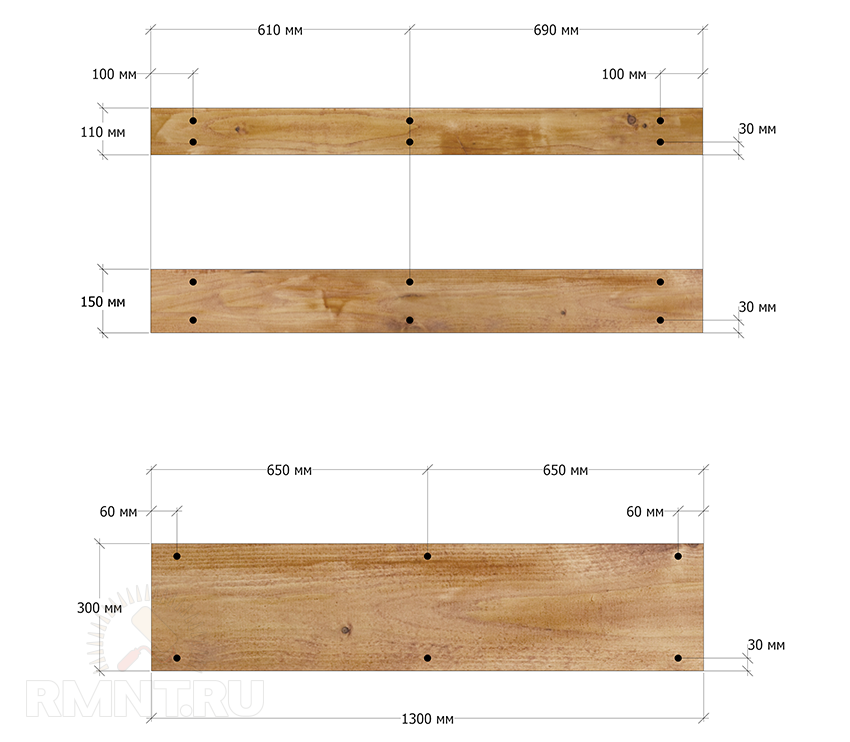 В досках боковин несущего каркаса по разметке сверлятся отверстия диаметром 5 мм, это делается для удобства сборки и для того, чтобы концы досок не расщеплялись при вкручивании в них саморезов.