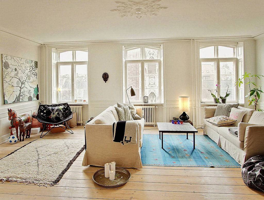 11. Типичный интерьер шведской квартиры: естественный тон древесины, дощатый пол и цветные коврики