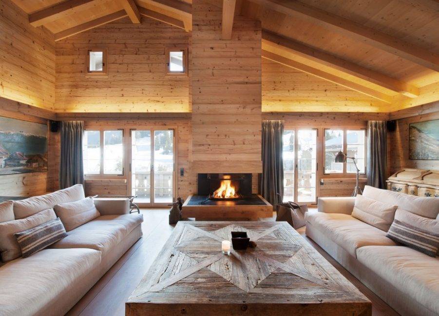 Натуральный материал не требует декоративной отделки, поэтому стены в домах из бруса оставляют открытыми, а интерьер “выстраивают” вокруг них. Удачно подчёркивают фактуру натурального дерева: