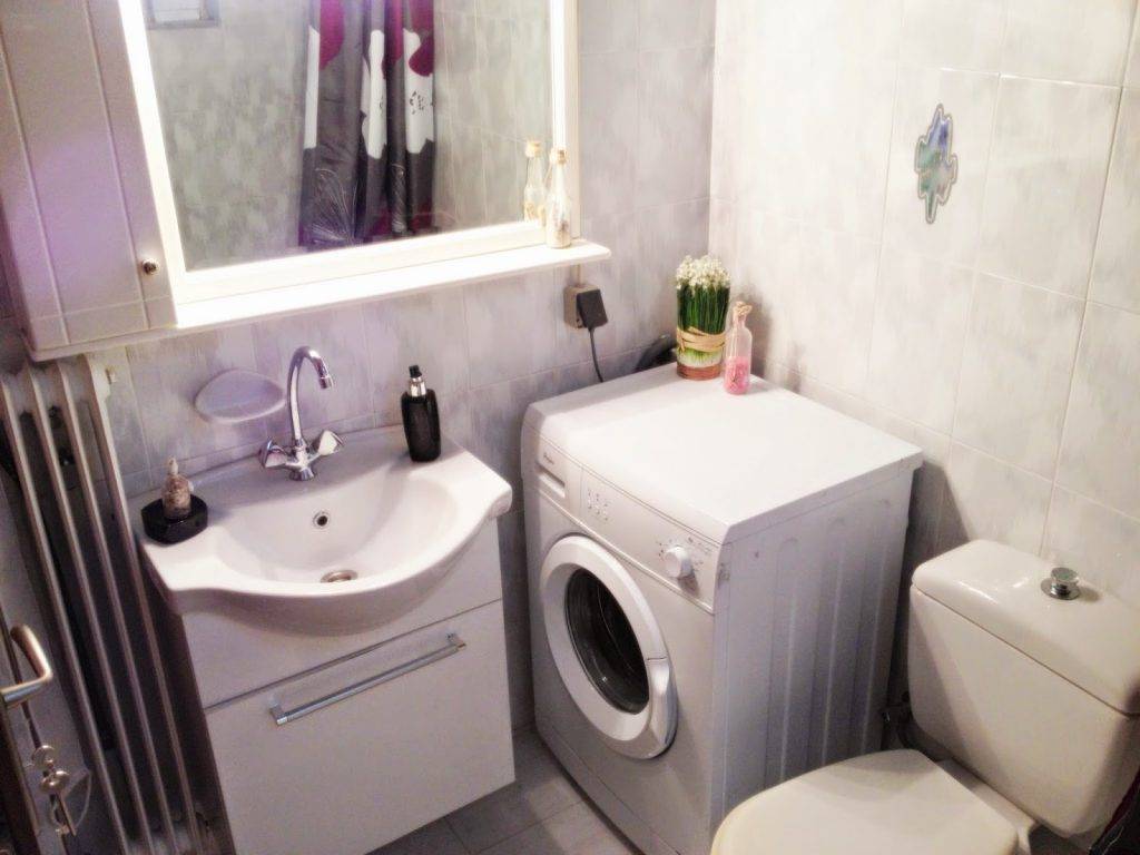 - Стиральную машинку в ванной можно будет установить лишь в одном месте – под раковиной. Следовательно, от традиционной тумбы придётся отказаться и одним местом для хранения станет меньше.