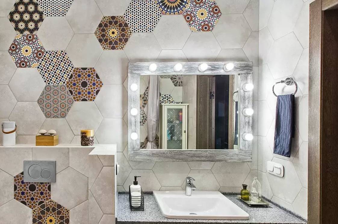 Морская тематика может быть создана за счет песочного пола и голубых стен с вкраплением контрастного орнамента. Консоль мойки лучше подобрать цвета натурального камня. А освещение идеально создать точечное.
