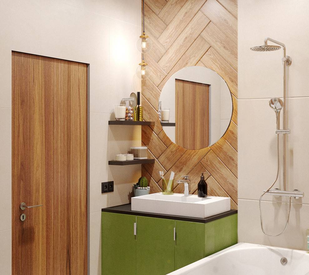 - В текущем году в тренд вошел эко-стиль. Такой дизайн отличается выраженными природными мотивами и оттенками. Сочетание идеально подходит для небольшой ванной комнаты площадью 4 кв. метра. Основным цветом лучше предпочесть бежевый или кремовый. Фактура может напоминать настоящее дерево или какую-либо мозаику. По-прежнему не стоит забывать, что глянцевые поверхности отлично отражают световые лучи. А для украшения специалисты рекомендуют выбирать предметы зеленого оттенка.