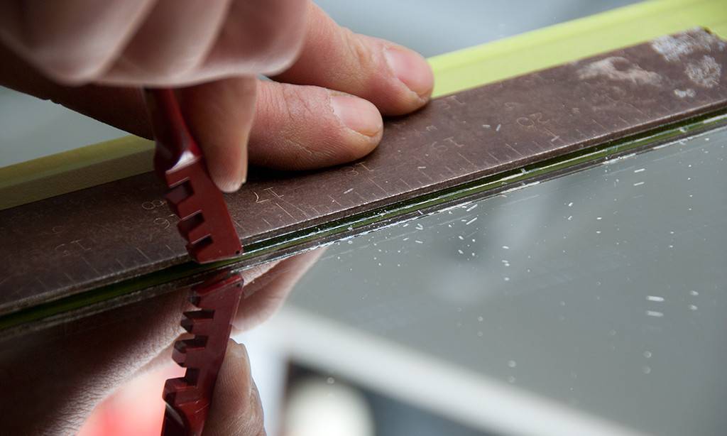 - Стеклорез следует прижать к материалу, а потом провести им по стеклу вдоль линейки. На материале должна остаться сплошная царапина.