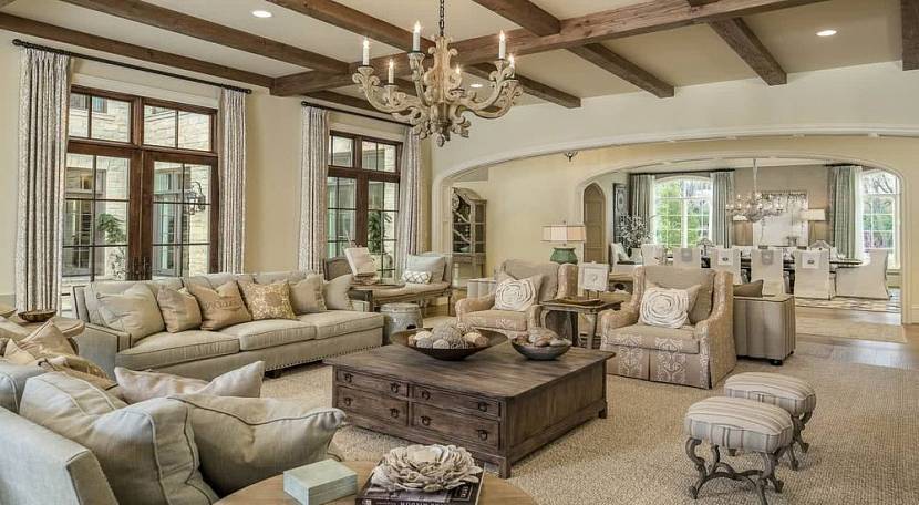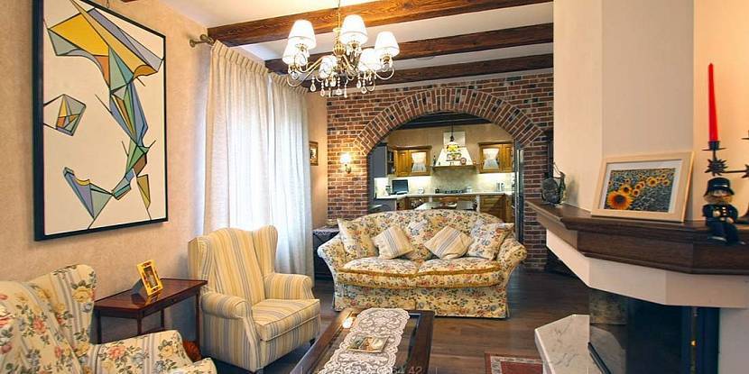 - Потолки в комнатах украшаются деревянными балками природного, темного цвета. Сейчас они выполняют только декоративную роль. Ранее в старых строениях они несли конструктивную функцию.