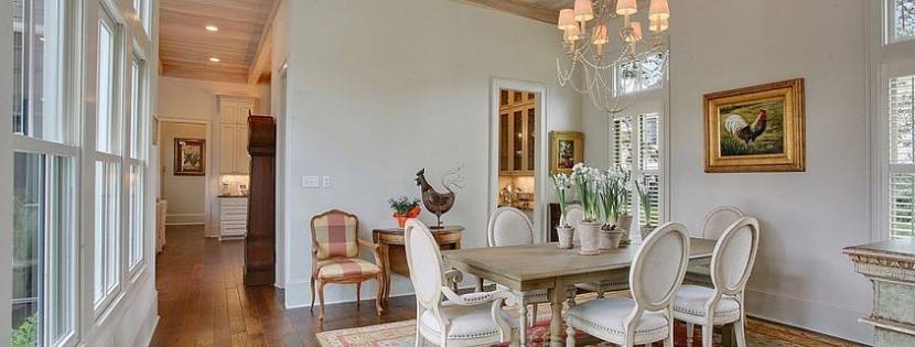 Даже потрескавшаяся древесина и наличие выемок от сучков не испортят интерьер. Моменты натуральности всегда остаются характерны. Стиль прованс может иметь некоторые контрасты. При этом цвета оформления не должны быть едкими и вызывающими. В идеале: кофейный и бежевый, белый и серый, оливковый и голубой. Если присутствует потолочный светильник, тогда вокруг него можно сделать шикарный цветочный узор.