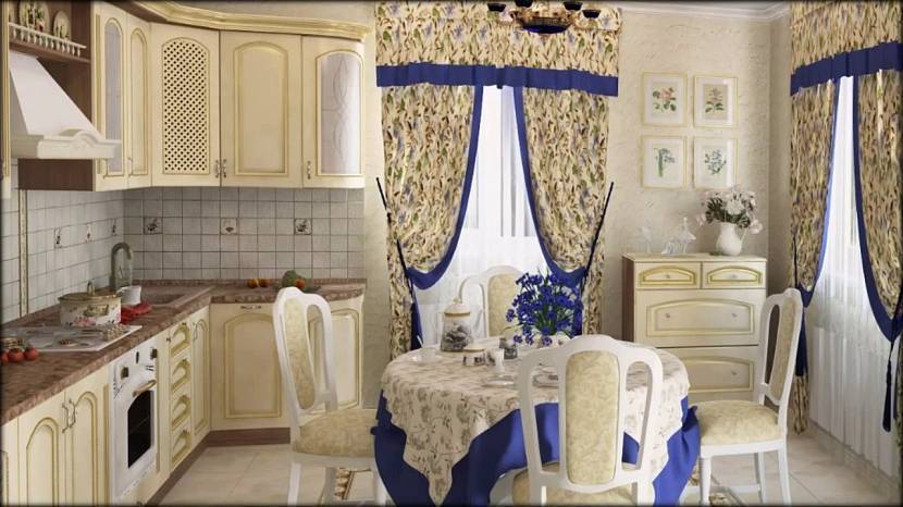 Начнем со штор. Шторы должны подчеркивать все особенности интерьера в стиле прованс, т.е. они должны быть выполненными из натуральных тканей, иметь спокойный оттенок или рисунок и быть полупрозрачными, чтобы не мешать солнечным лучам спокойно проникать внутрь квартиры и заливать ее светом. Для украшения оконных проемов можно подобрать практически прозрачные занавески или римские шторы. Предпочтение отдается натуральным тканям, в т.ч. муслину, хлопку, ситцу, льну. Украшать шторы могут банты, кружева, рюши и даже бусы. Обрамлять окна лучше однотонной тканью светлого цвета. Также хорошо будут смотреться шторы в мелкий цветочный рисунок или с растительным орнаментом. Реже используется геометрический рисунок (полоска, клетка).