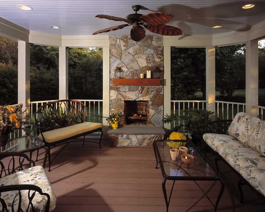 Дизайн веранды открывает широкие возможности для реализации различных идей, например, Вы можете установить на ней камин