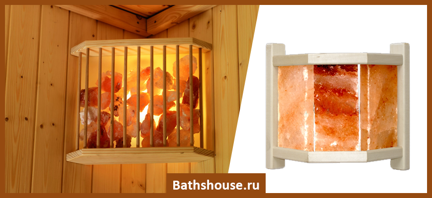 Светильник может быть выполнен в оригинальном формате и отлично гармонировать с обстановкой, вписываясь в дизайн комнаты с деревянной обшивкой. Натуральные материалы подойдут лучше всего, поэтому часто в парную ставят приборы из гималайской соли. Это красиво и полезно для здоровья. В состав соли входит 90 минералов. Ее добывают со дна древнейшего озера, о котором в народе сложили массу легенд. Солевые плафоны бывают разных форм и оттенков. При нагревании до 60 градусов соль выделяет отрицательные ионы, способные дезинфицировать воздух. Лечение в такой парной рекомендовано людям, которые страдают болезнями кожи, сосудов, дыхательной системы, аллергией. (Читайте статью на тему «Соляная баня и сауна: польза и вред, устройство, особенности»)