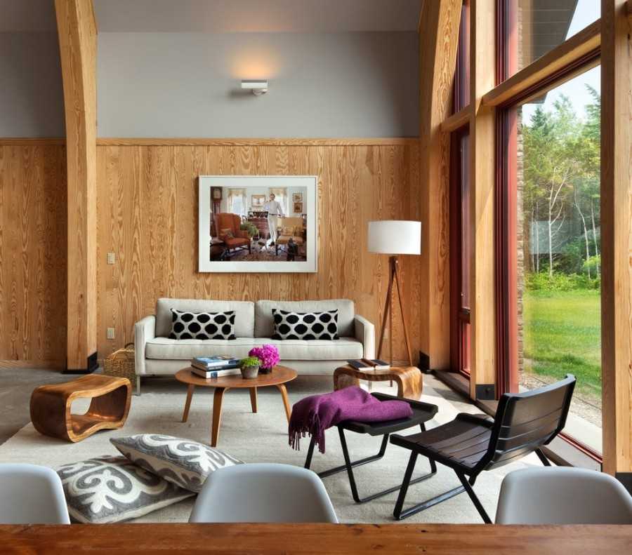 Горизонтальное расположение ламината, имитирующего лакированную сосну, на стене загородного дома