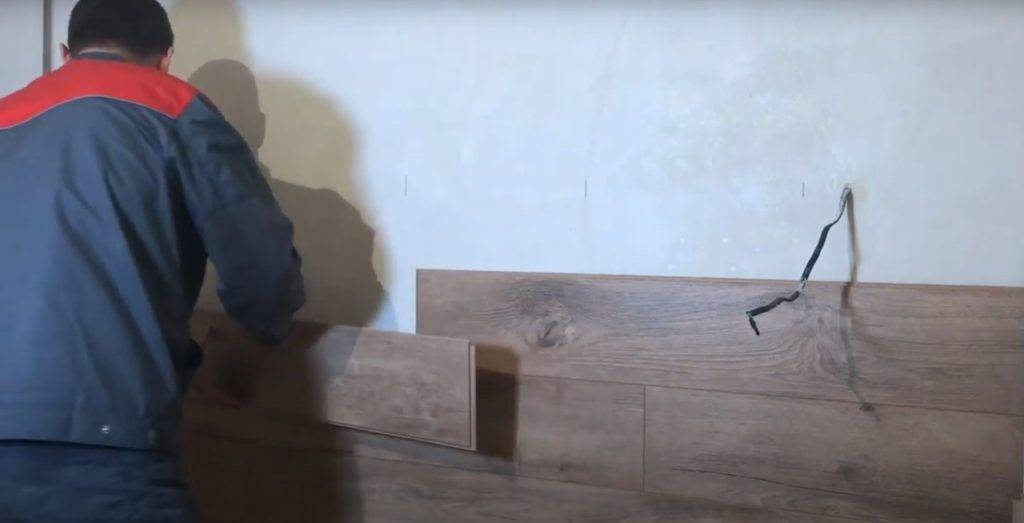 Сами замки в этом случае лучше тоже проклеить. В редких случаях под ламинат сначала монтируют настенную обрешетку. Делают это, если стены очень кривые, а на устранение перепадов с помощью штукатурки или гипсокартона нужно много ресурсов (время, деньги);