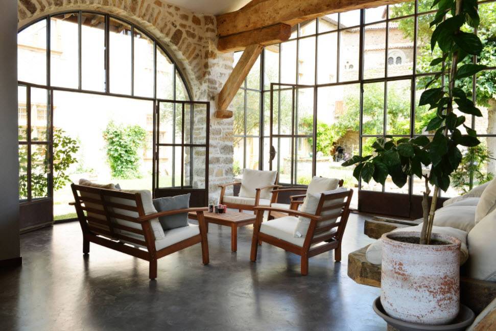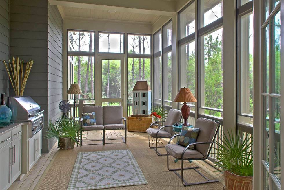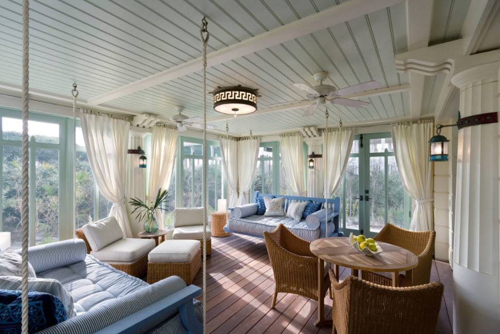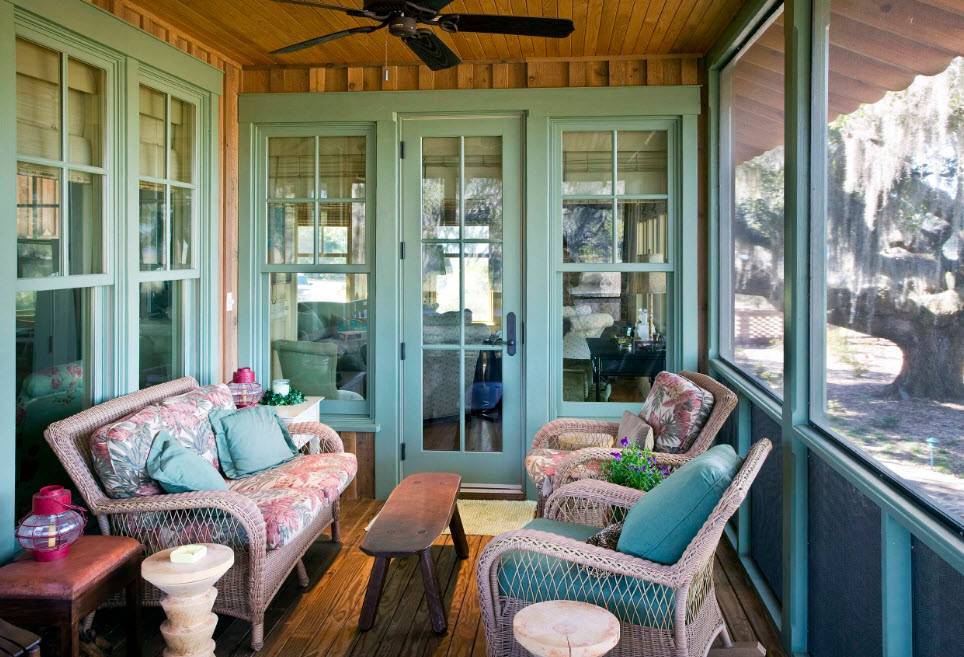 Дизайн закрытой веранды имеет важное значение при выборе обстановки. В духе прованса будут смотреться небольшие диванчики и кресла, обитые текстилем в полоску или с цветочным принтом