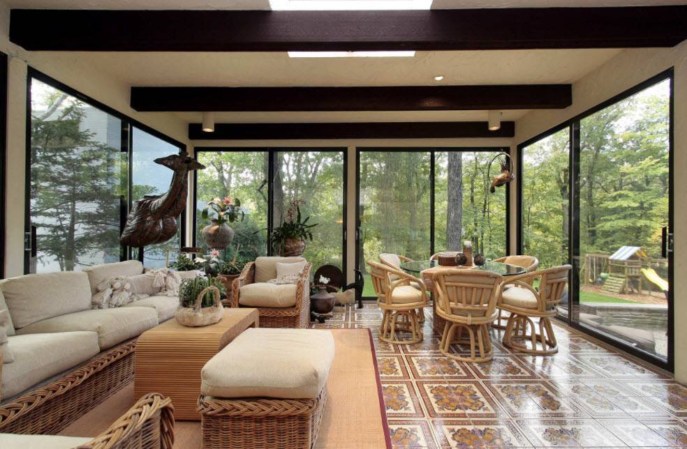Внутреннее убранство веранды – это не только красивая мебель и декор, но и облицовка всех поверхностей. Выбор материалов будет зависеть от размеров всей конструкции, высоты потолков и особенностей планировки.