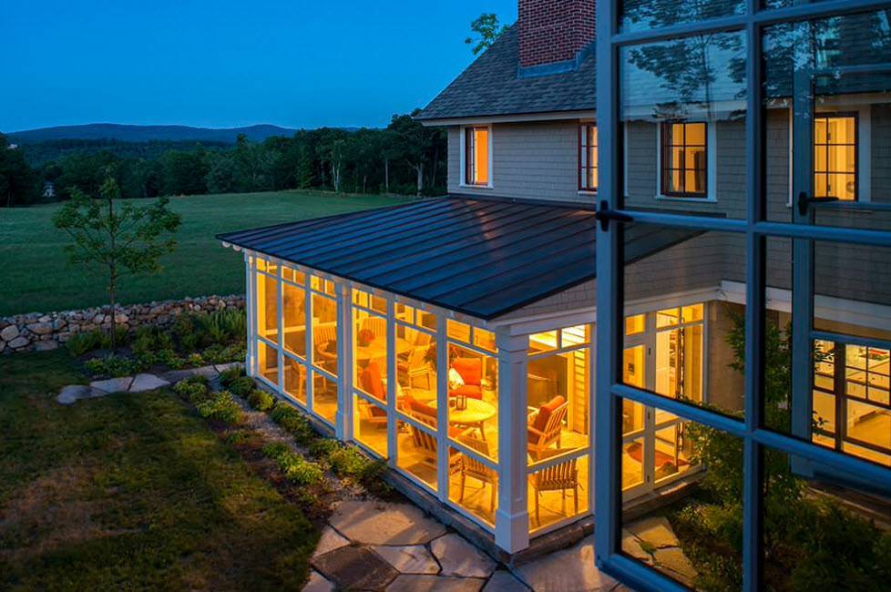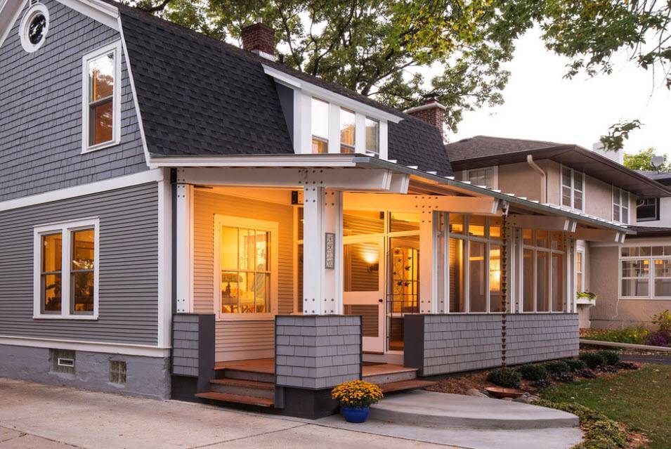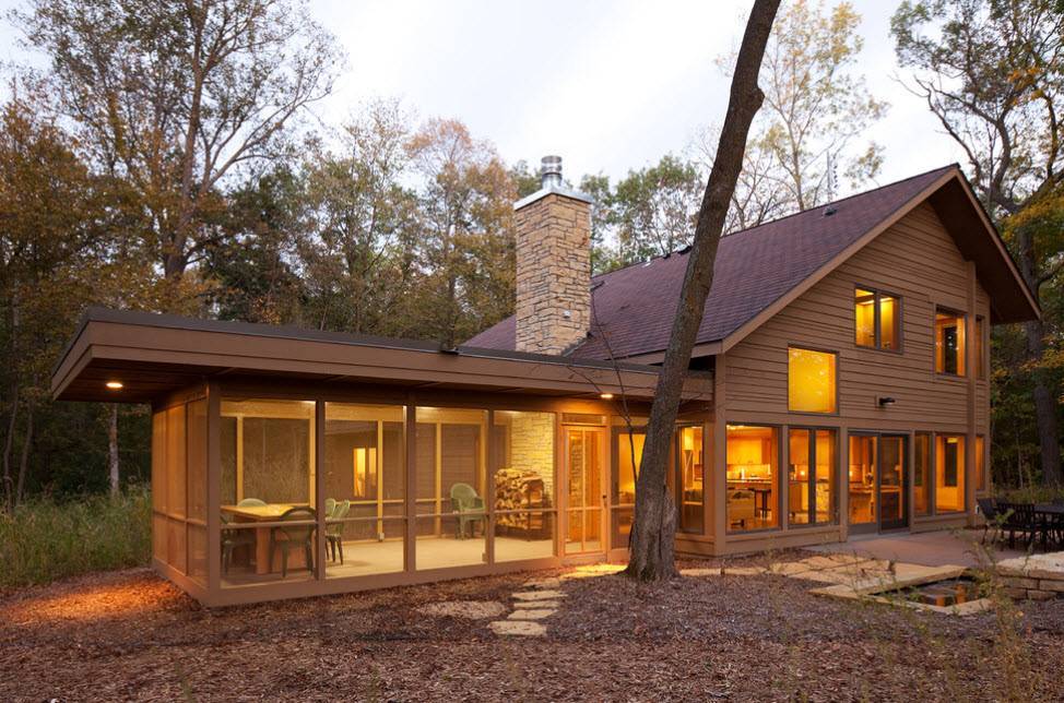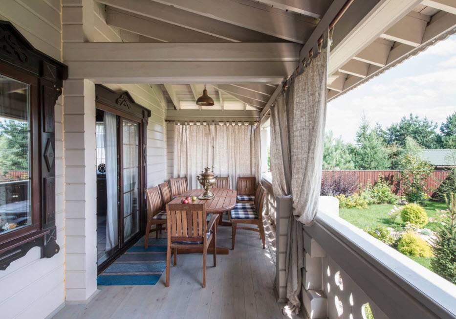 Веранда может быть открытой или закрытой. Если ее утеплить, она помогает расширить габариты дома. В помещении часто размещают столовую, кухню, библиотеку и рабочую зону, сад, творческий уголок. Можно соединить сразу несколько направлений.