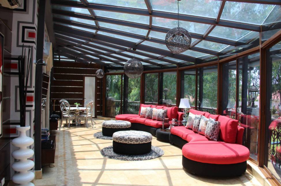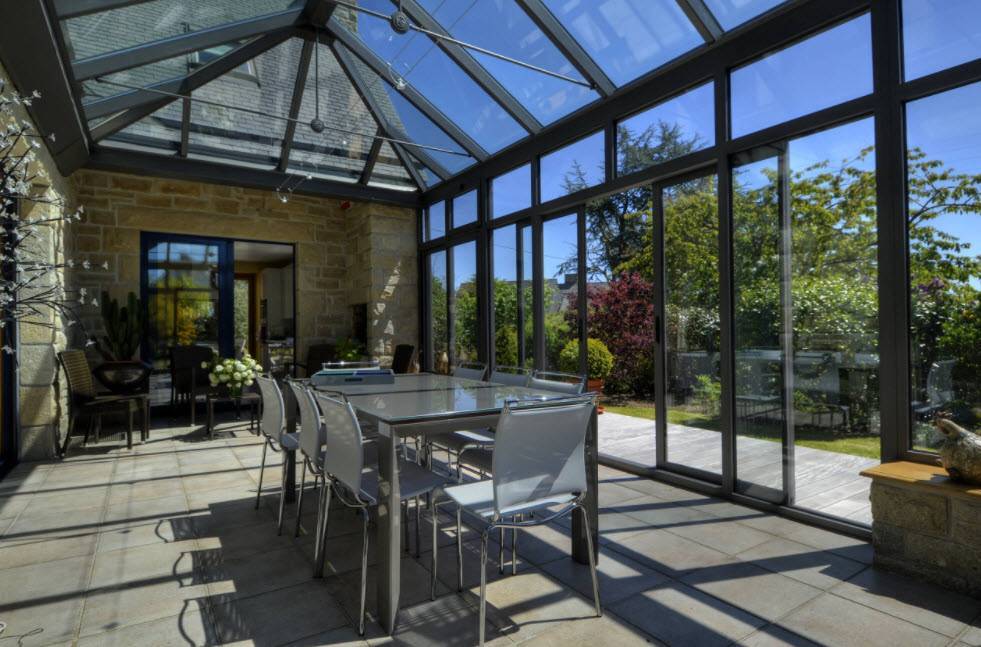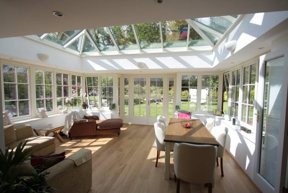 Стеклянный потолок – оригинальная идея оформления веранды с панорамным остеклением.