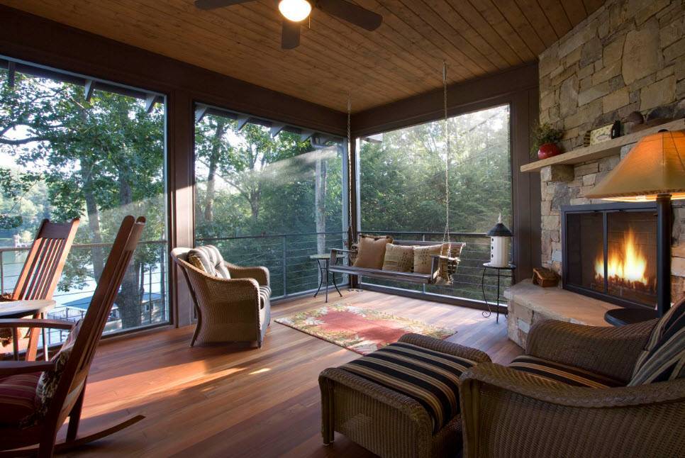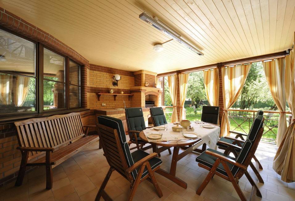Утеплить помещение можно, установив внутрь обогреватели – тогда можно пользоваться верандой круглый год, не боясь замерзнуть. В этом случае будут актуальны как подвесные, так и натяжные потолки. Можно провести освещение, монтировать люстры и точечные светильники. Подсветка бывает встроена также в стены и пол для создания особой атмосферы.