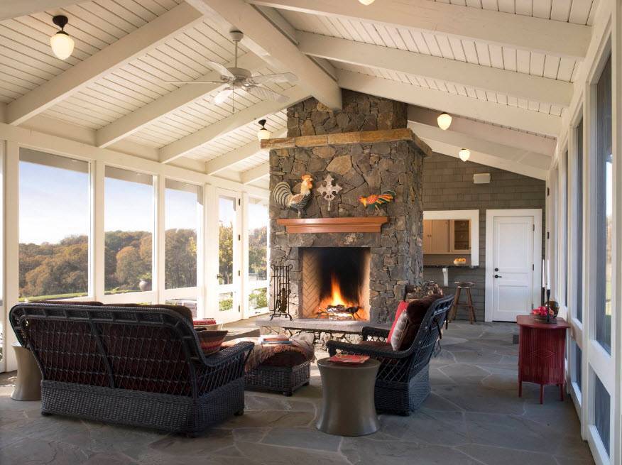 Помимо перечисленных материалов для внутреннего обустройства пространства веранды иногда используют бутовый камень, базальт, мрамор или песчаник. Таким образом можно выложить пол, придав интерьеру особую роскошь.