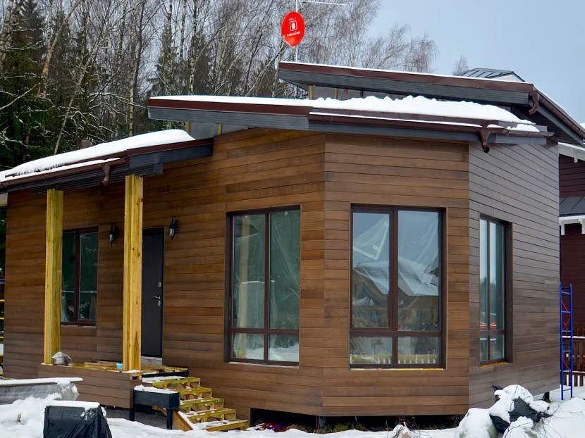Для отделки деревянного дома используются материалы, устойчивые к влаге: фанера типа ФСФ, на клееной основе или ламинированная. Полотна монтируются на обрешётку, а стыки заполняются герметиком и маскируются рейками. Поверхность обрабатывается антисептическим составом, защищающим от грибка, а также подчёркивающим красивый рисунок древесины.