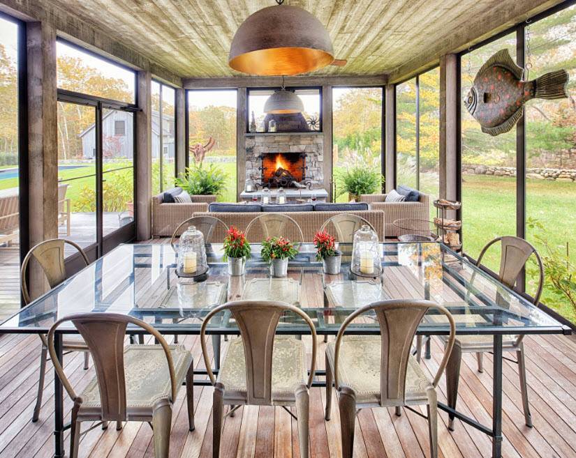 Влагостойкий гипсокартон подойдет для отделки закрытой веранды, оформленной в скандинавском стиле. Если на веранде есть камин, близлежащие части стен покрывают огнеупорными материалами (плитка, каменная кладка).
