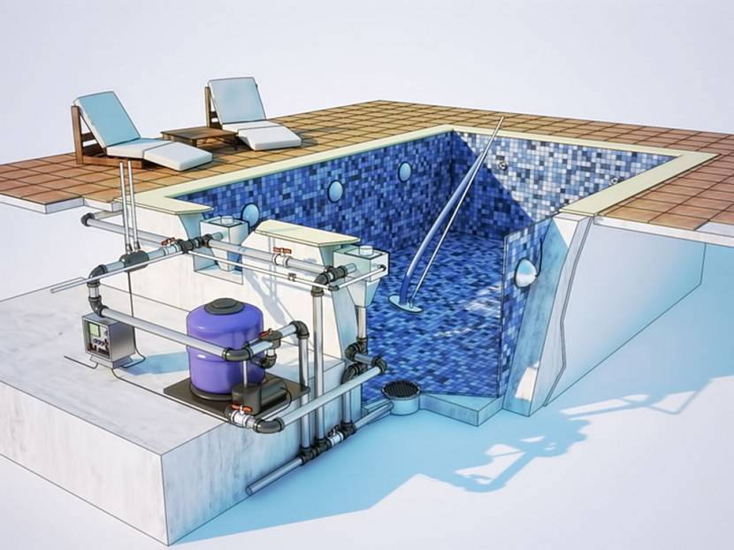 Начнем с того, что бассейн – гидротехническое сооружение, требующее большого объема водной массы. И если использовать для наполнения чаши обычный водопровод, то ждать придется долго, особенно если сам резервуар – это объемная емкость. На это потребуется несколько дней. Поэтому необходимо установить в водопроводную сеть насосное оборудование. При этом его комплектуют различными фильтрами. А на монтаж всего этого оборудования потребуется место. Нередко установку проводят внизу рядом с домом, протягивая к бассейну только трубную разводку.