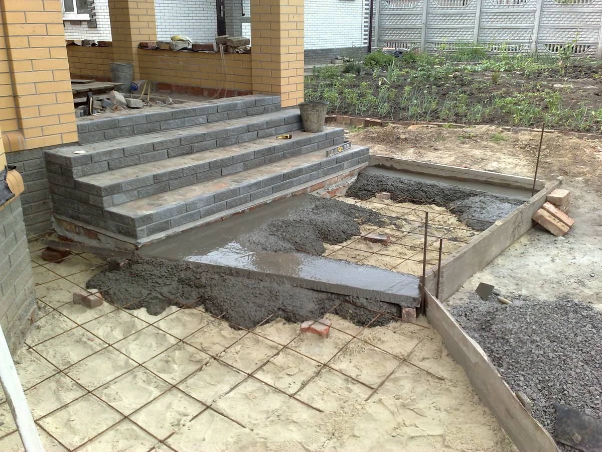 Также нужно знать, что бетонная конструкция требует использования армированного каркаса, который позволит равномерно распределять нагрузку. Стоимость крыльца из данного материала будет максимальной, по сравнению с кирпичным или деревянным.