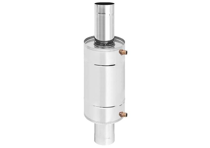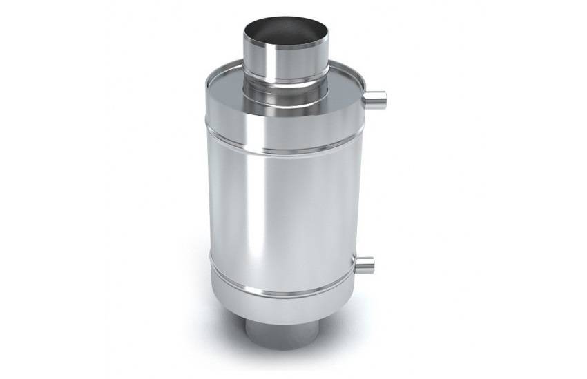 В продаже имеется довольно обширный ассортимент теплообменников для банной печи. Однако все они предназначены для установки на нижний сегмент дымохода, то есть это устройства самоварного типа. Есть внешние теплообменники на трубу малого диаметра — 55 мм, встречаются довольно крупные емкости объемом около 40 л, сразу же соединенные с участком дымовой трубы.
