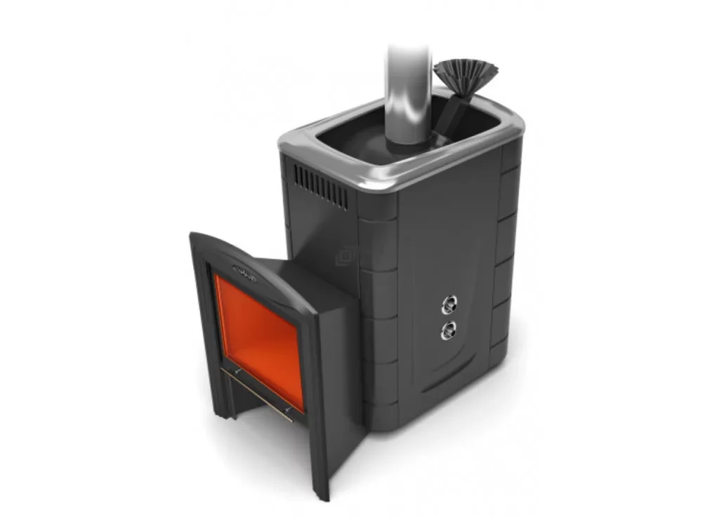 А периодическая модель не допускает открытия дверцы, пока полностью не прогорит топливо. Делается так из-за налёта сажи, которым покрывается поверхность камня (если на такой камень плеснуть воды, сажа окажется в помещении, на полке и людях). Кроме того, угарный газ тоже проникнет в парную вместе с дымом.