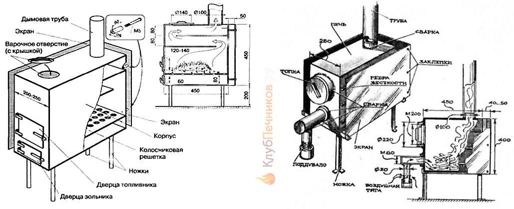 Классическая буржуйка для дачи на дровах, имеет простую конструкцию и устройство, но, отличается большими теплопотерями. Современные модели, используют принцип длительного горения. Усовершенствованное устройство дровяных печек, обеспечивает лучшую теплоотдачу и КПД.