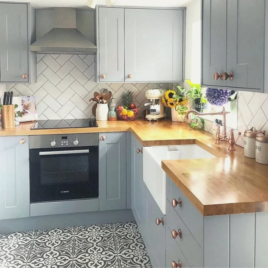 Рабочая зона на маленькой кухне в хрущевке оформляется материалами, которые легко моются и не занимают много места. Для фартука подойдет керамическая плитка, скинали или закаленное стекло. Дизайнеры рекомендуют выбирать однотонные материалы или с узором, характерным для выбранного стиля, например, плитка с печворк для прованса. При этом узор должен присутствовать только на фартуке, чтобы не перегружать интерьер деталями
