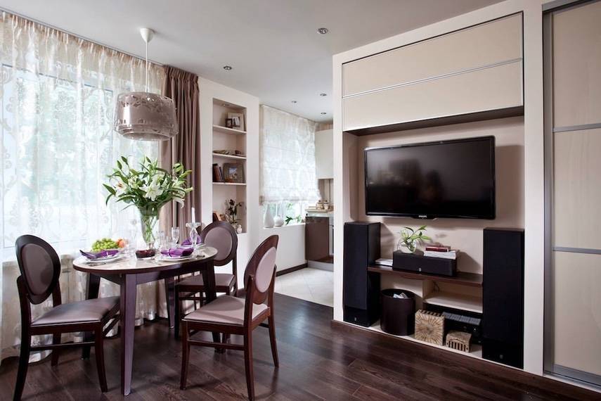 Архитектурный вариант зонирования предполагает возможность возведения арки или фальш-стены, на которую с одной стороны вешают плазменный телевизор или красивые картины, а с другой размещают обеденный стол.