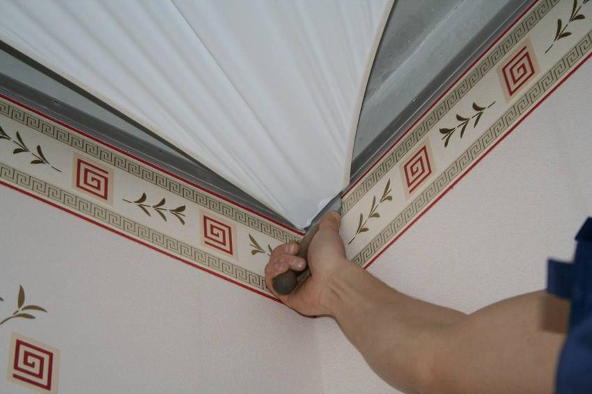 | Шаг 2 | Определяем места фиксации прорезных вставок, закрепленных между полотном и стенами помещения. Снимаем эти вставки. |