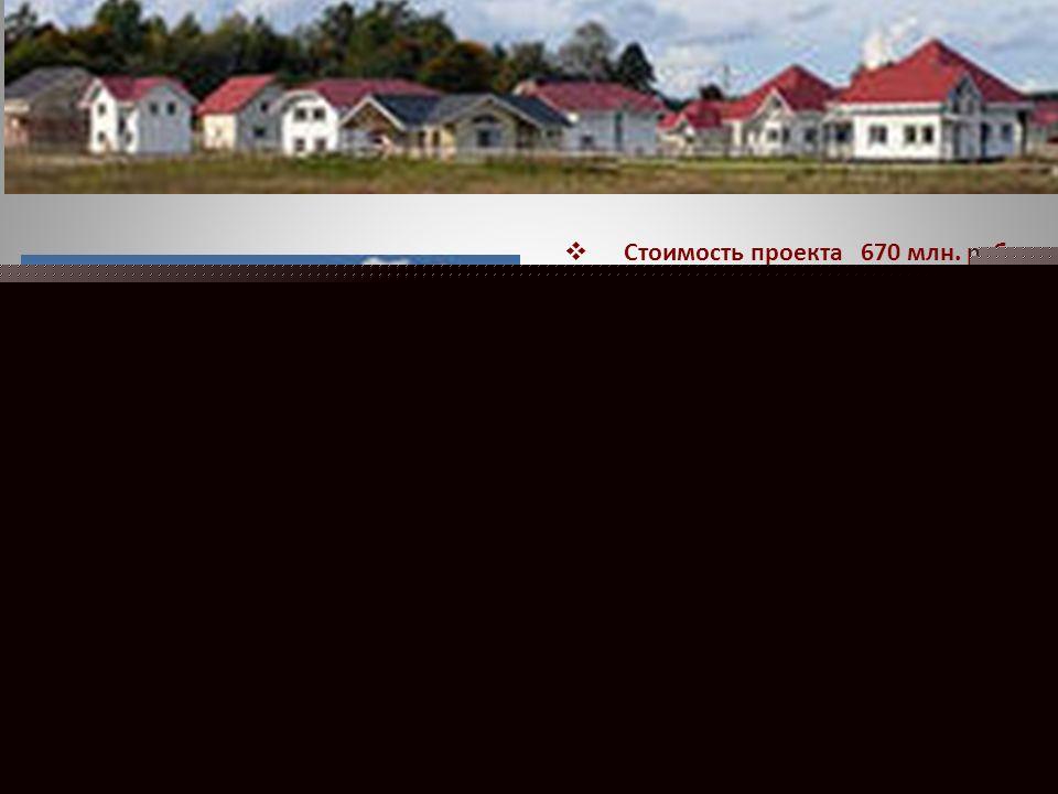 Расчет инвестиционных затрат Инвестиционные затраты Тыс. руб. Статьи затрат Кол-во Стоимость 1 ед. Сумма, тыс. руб. Организация управляющей компании Приобретение земли и размежевание Смета, разрешения и т.д Строительство коттеджей Подведение воды, электричества и газа, устройство канализации Устройство дорог и т.д Регистрация недвижимости Реклама и продвижение Итого Общая сумма инвестиций составляет 670 млн. руб.