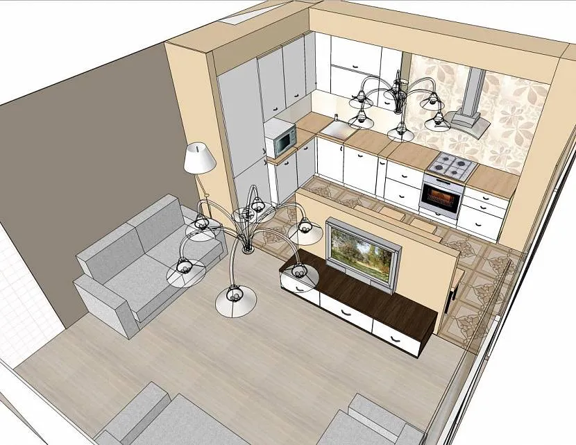 Удачный интерьер кухни-гостиной на 16 кв. м напрямую зависит от освещения. Именно с электрической проводки начинаются любые работы. Не жалея средств во время ремонта, можно значительно сэкономить на электроэнергии по его окончании. Студия должна быть хорошо освещенной в целом и зонально. Ламповые системы, люстры, точечные светильники по потолку будут освещать все пространство во время совместных семейных ужинов и угощения гостей. Настенные бра, лампы, электрические декоративные подсветки создадут уютную романтическую атмосферу во время отдыха в гостиной зоне. Яркие точечные светильники, расположенные по периметру подвесных шкафов и столешниц, помогут осветить нужный рабочий участок.