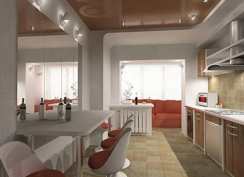 - Снос стены между кухней и смежной комнатой, установка новой перегородки или частичное сохранение стены в виде арочного проема.